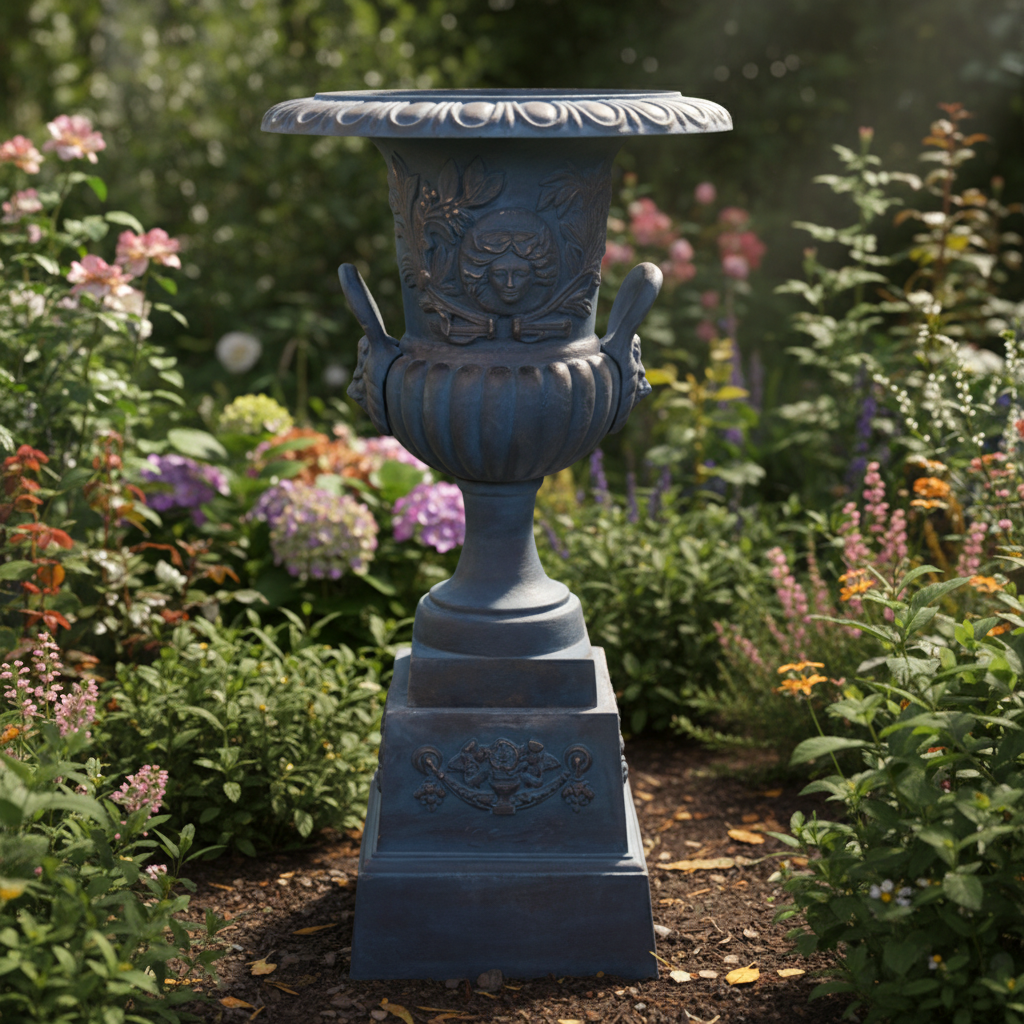 PROVINCE MILANO CAST IRON URN AND BASE SET - ANTIQUE BLUE 110CM
