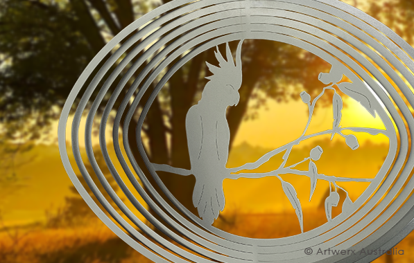 Our latest 2021 Stainless Steel Cockatoo Wind Spinner is a beautiful new Australian themed design featuring a lovely cockatoo perched on a native Australian Gumnut tree.
