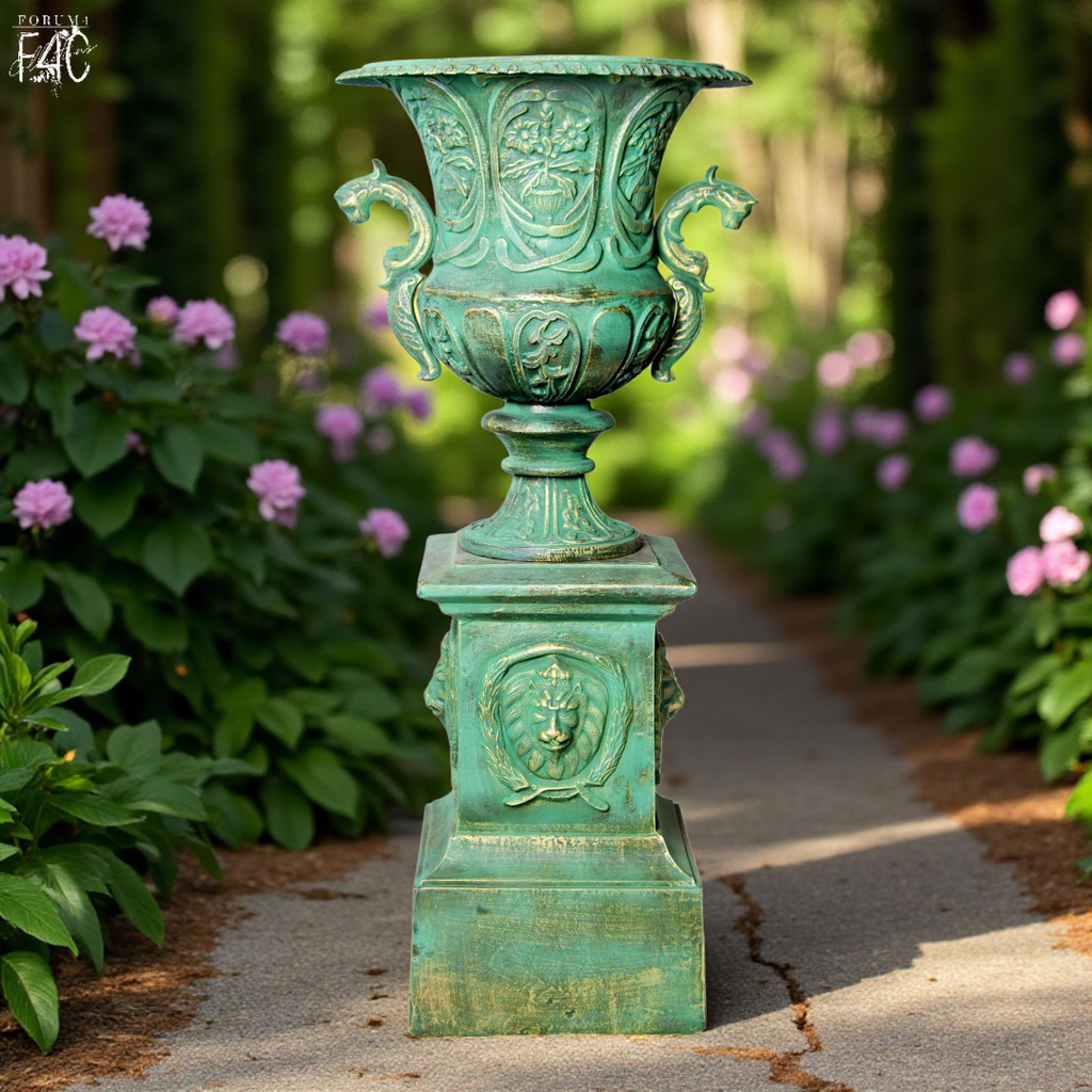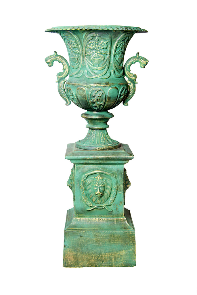 PROVINCE BORDEAUX CAST IRON URN AND BASE SET - ANTIQUE GREEN 160CM