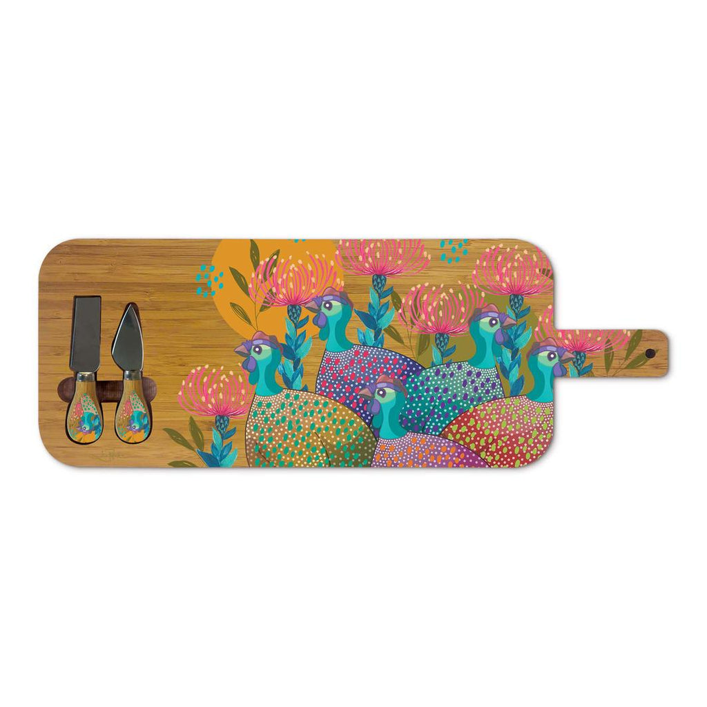 Colourful Guinea fowl bamboo serving patter with matching cheese knives