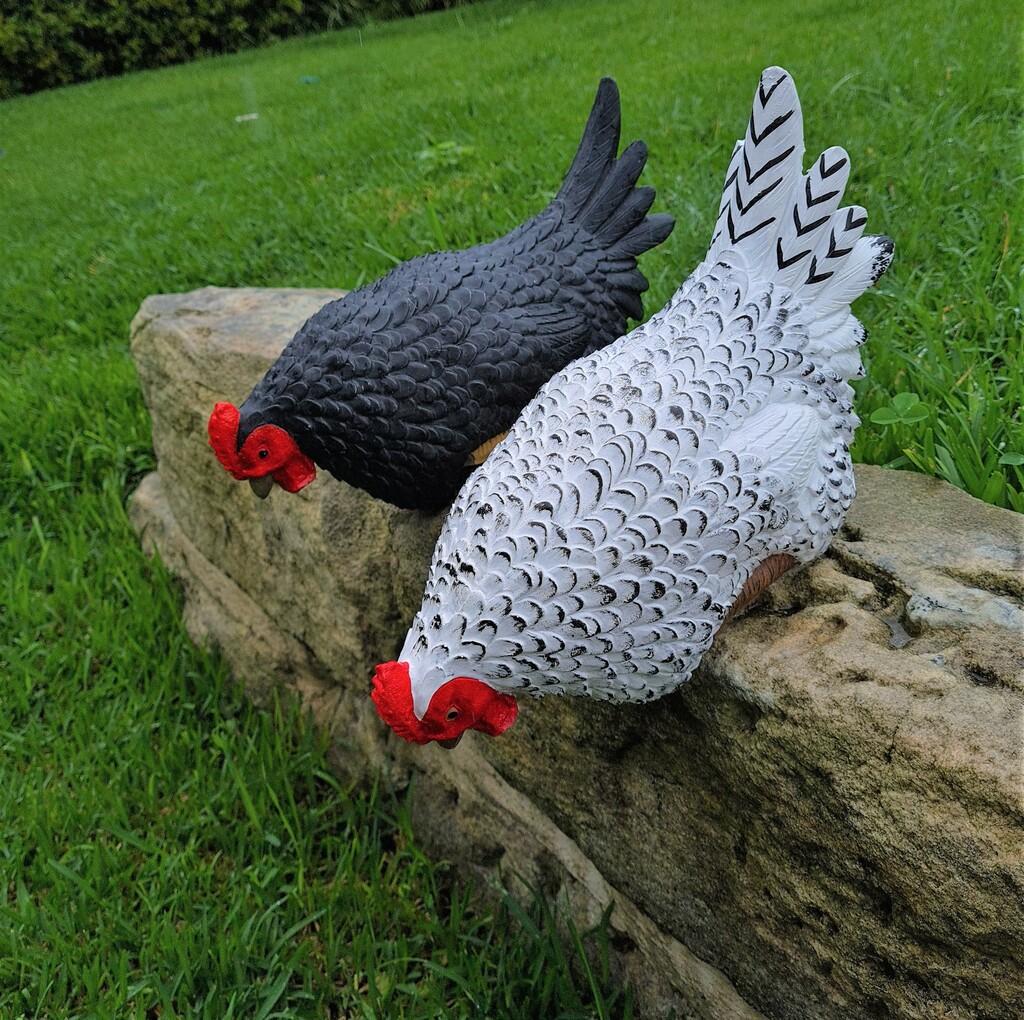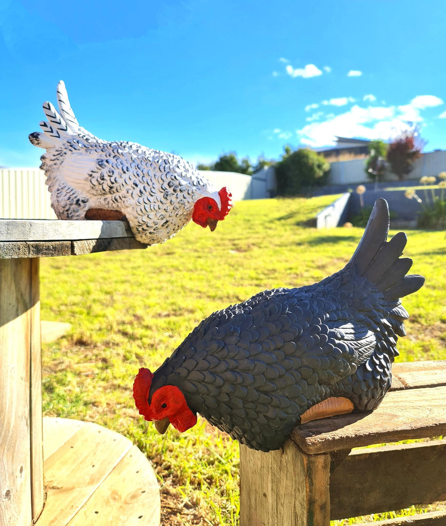 Polyresin hen with flat bottom, suitable for sitting shelf step or ledge.