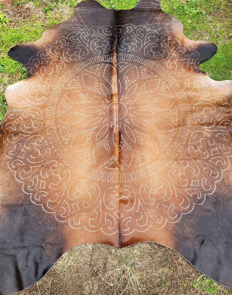 LARGE GENUINE COW HIDE FLOOR RUG - ETCHED MANDALA