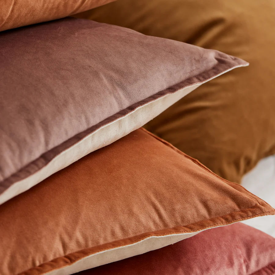 Rust colour velvet with natural linen reverse, flange and concealed zip