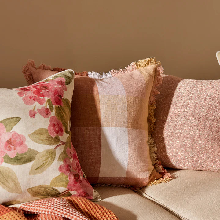 Double-sided warm pink multi-check cushion. Fringed flange and concealed zip.