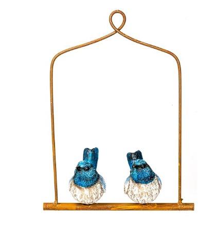 BLUE WREN PAIR ON A RUSTED HANGING FRAME
