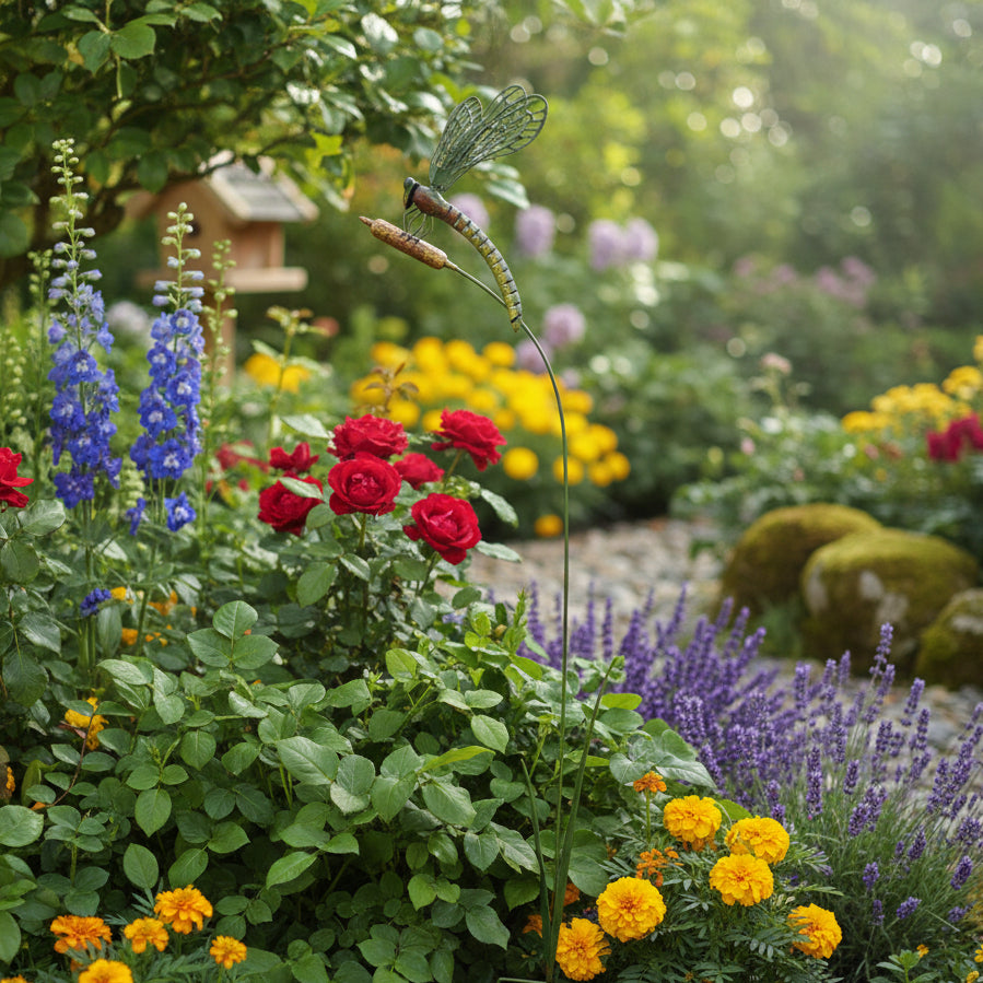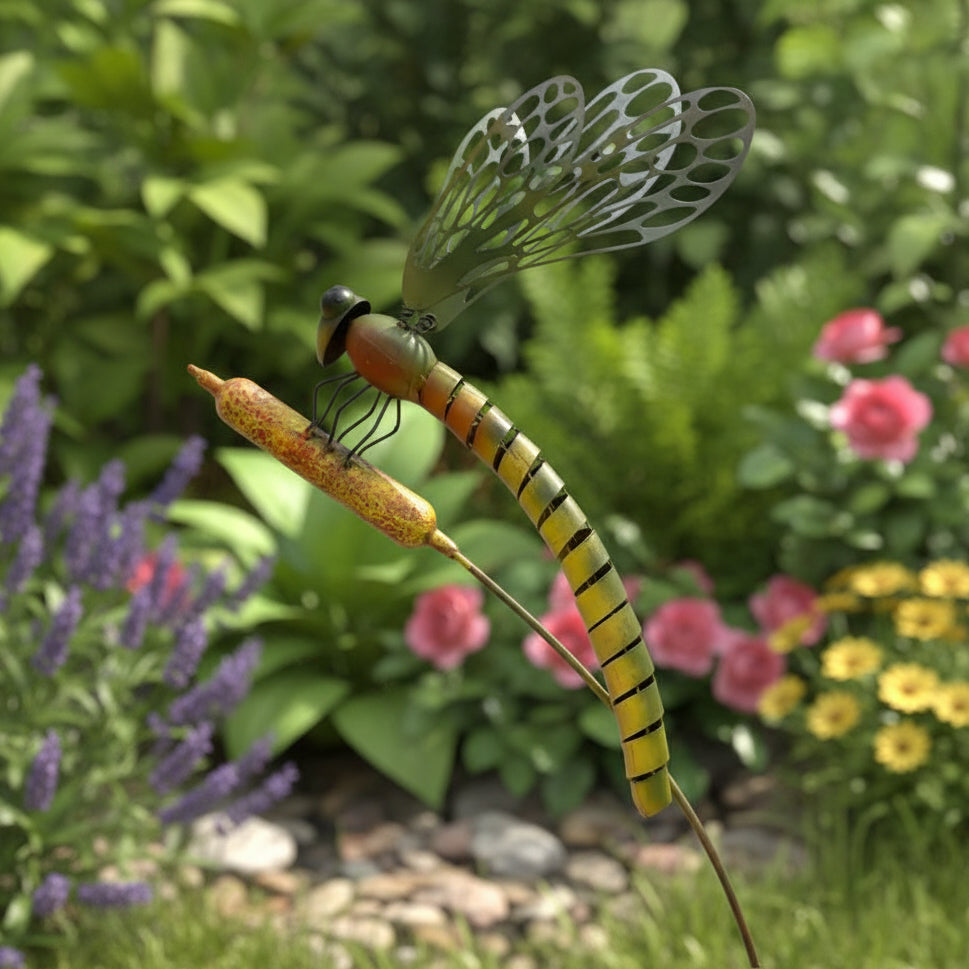 FLYING DRAGONFLY ON REED GARDEN STAKE