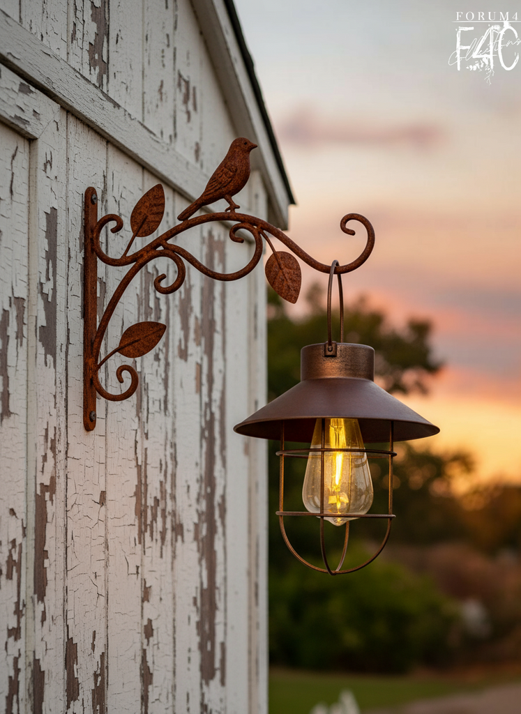 RUSTIC BRUSHED COPPER HANGING SOLAR LIGHT WITH RUSTY ORNATE WALL BRACKET + STAKE