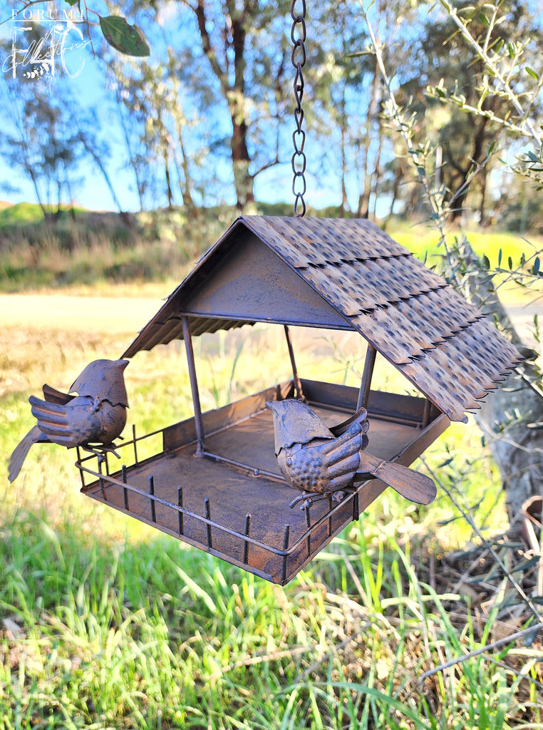 Rustic Hanging house with two Birds on a fence - bird feeder