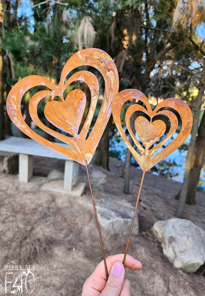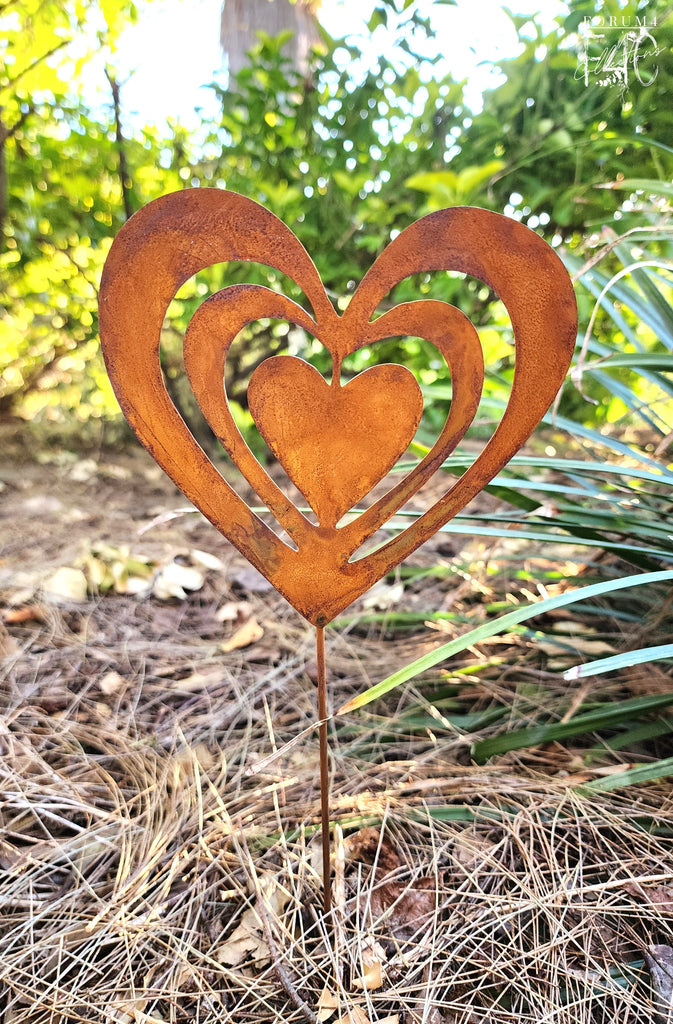 LARGE RUSTY TRIPLE HEART GARDEN STAKE