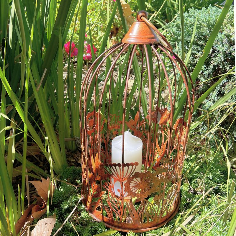 RUSTIC DECORATIVE METAL FLORAL BIRD CAGE / CANDLE PLANT HOLDER