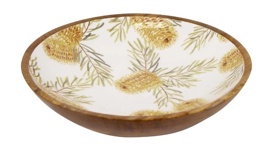 The Banksia Salad Bowl is perfect for serving guests a wide range of salads. Made with a banksia printed enamel insert and a contrasting mango wood exterior, this piece seamlessly combines style and practicality.
