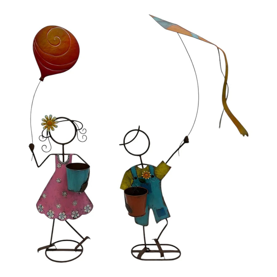 Add a playful touch to your garden or outdoor space with these charming metal sculptures of a boy and girl, each playfully posed and designed to hold your favorite plants. Crafted from durable metal, these sculptures are coated in bright, eye-catching colours that make them a fun and lively addition to any setting. Their open-planter design makes them not only decorative but also functional, allowing you to display plants and flowers with a unique twist.