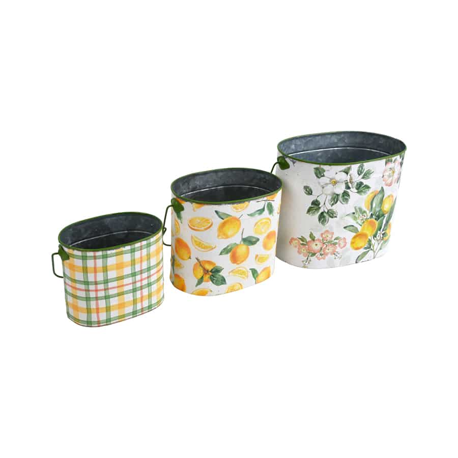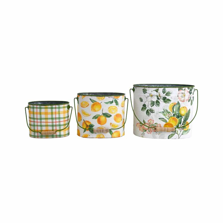 Brighten up your potted plants in classic French country design using the Summer Lemons Pot Planter Buckets - Set of 3. Crafted from durable metal in a bright lemon printed design, these lovely planter buckets will give your home a splash of colour. Features three different designs, each bucket a different size. Simply add pot plants of flowers, herbs, succulents or a faux plant if you prefer to add a touch of greenery and natural element to your home.
