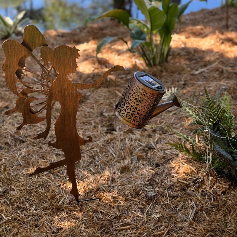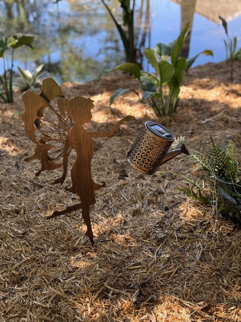 RUSTIC BRONZE FAIRY STAKE WITH SOLAR WATERING CAN