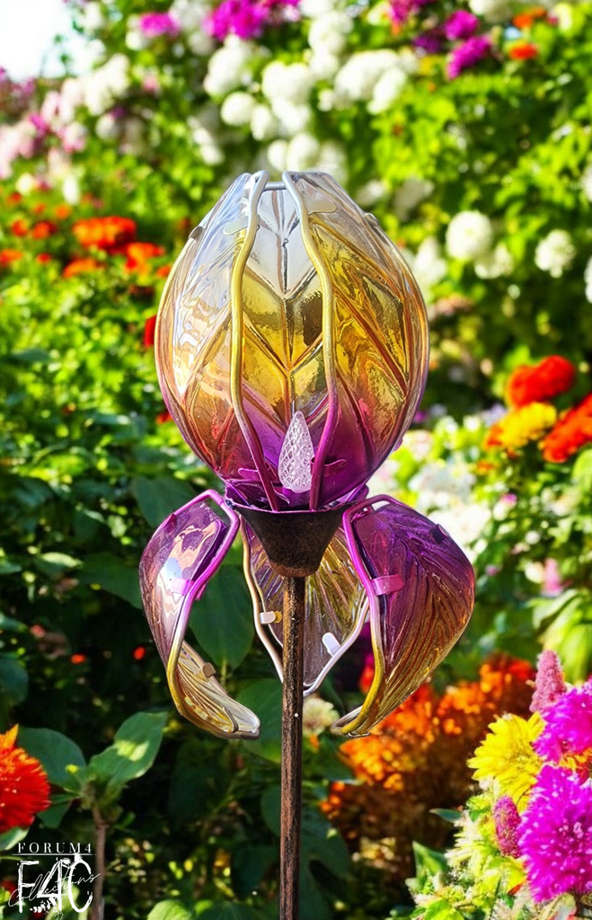 Illuminate your garden with this elegant glass solar light, designed to resemble an iris flower. Available in purple, blue, yellow & sunset pink. It charges during the day and emits a beautiful glow at night.