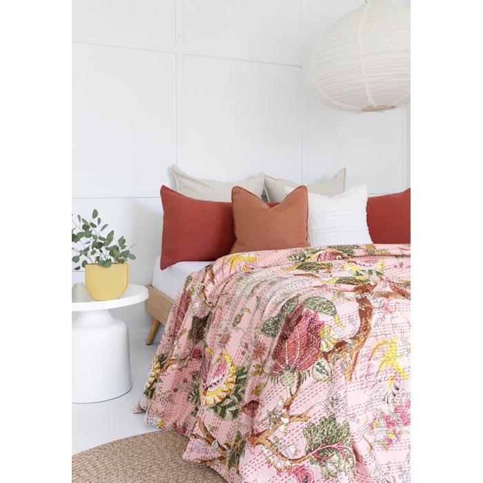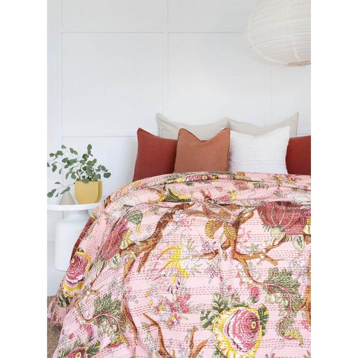 Hand crafted softly quilted handmade by artisans in India. The entire quilt is painstakingly hand embroidered with end number of straight running stitches to create a unique product, one of a kind (No two are alike), thus it’s a perfect GIFT too (Wedding Gift). All these make them a Vintage Kantha Quilt.