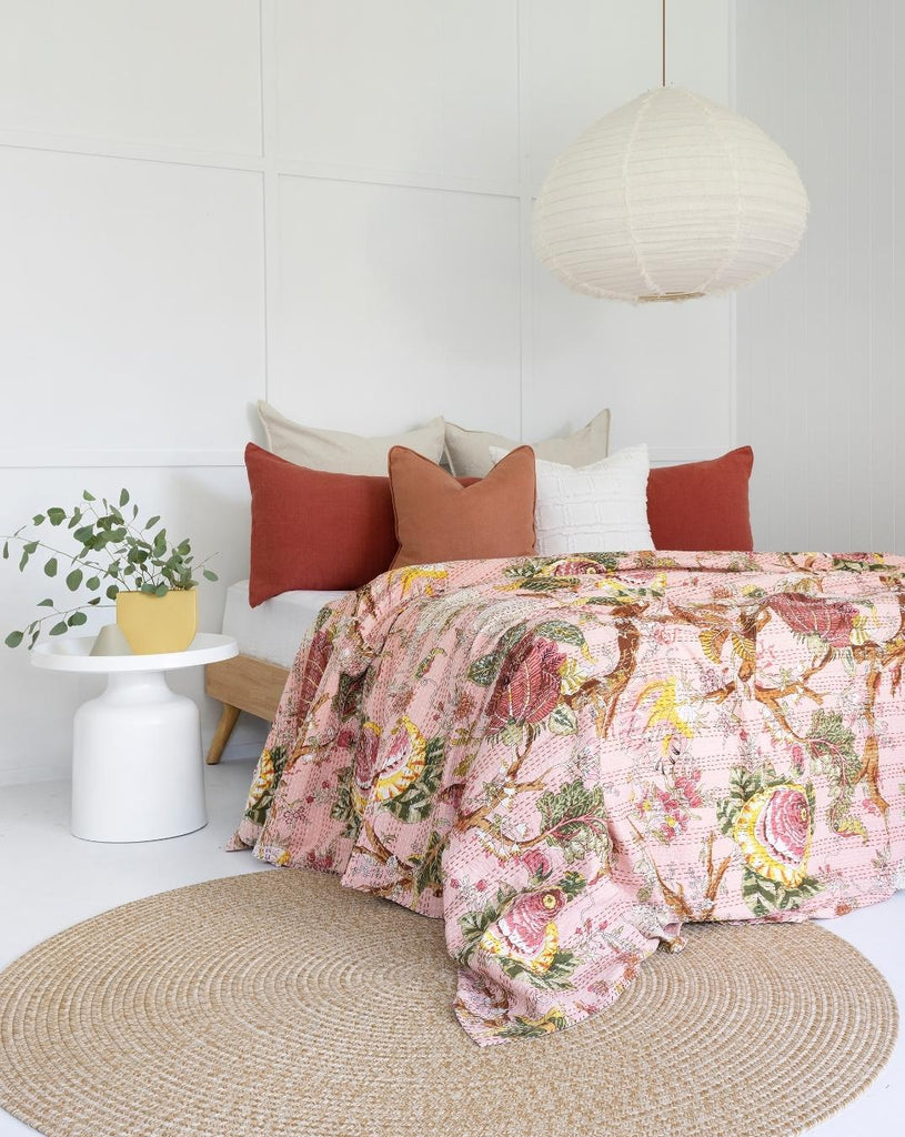 Hand crafted softly quilted handmade by artisans in India. The entire quilt is painstakingly hand embroidered with end number of straight running stitches to create a unique product, one of a kind (No two are alike), thus it’s a perfect GIFT too (Wedding Gift). All these make them a Vintage Kantha Quilt.
