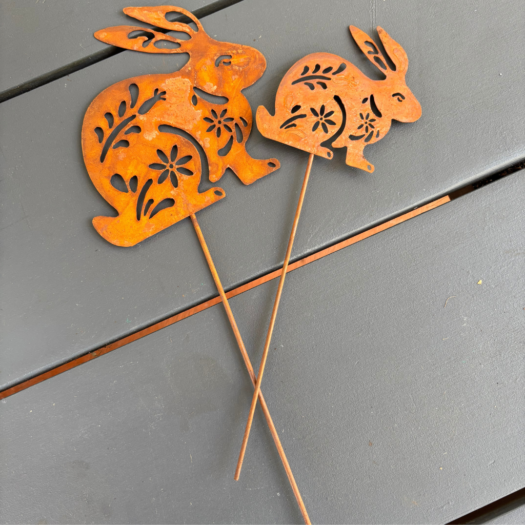 Product Description: Set of 2 Natural Rust Rabbit Stakes Size: