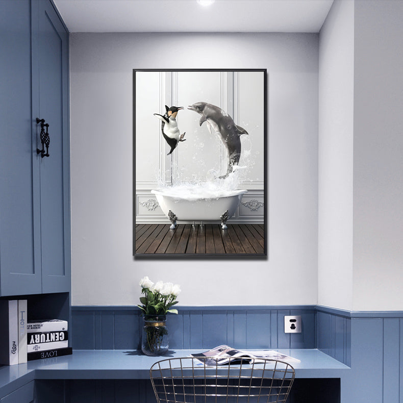 BLACK & WHITE ART SERIES - FRAMED CANVAS ART - PENGUIN & DOLPHIN BATH TIME