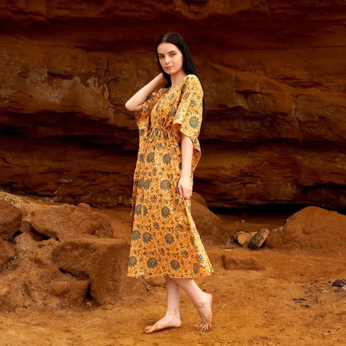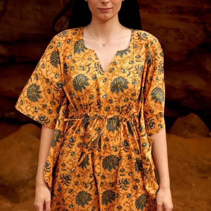 Cotton Kaftan Kimono Cardigan mustard yellow print