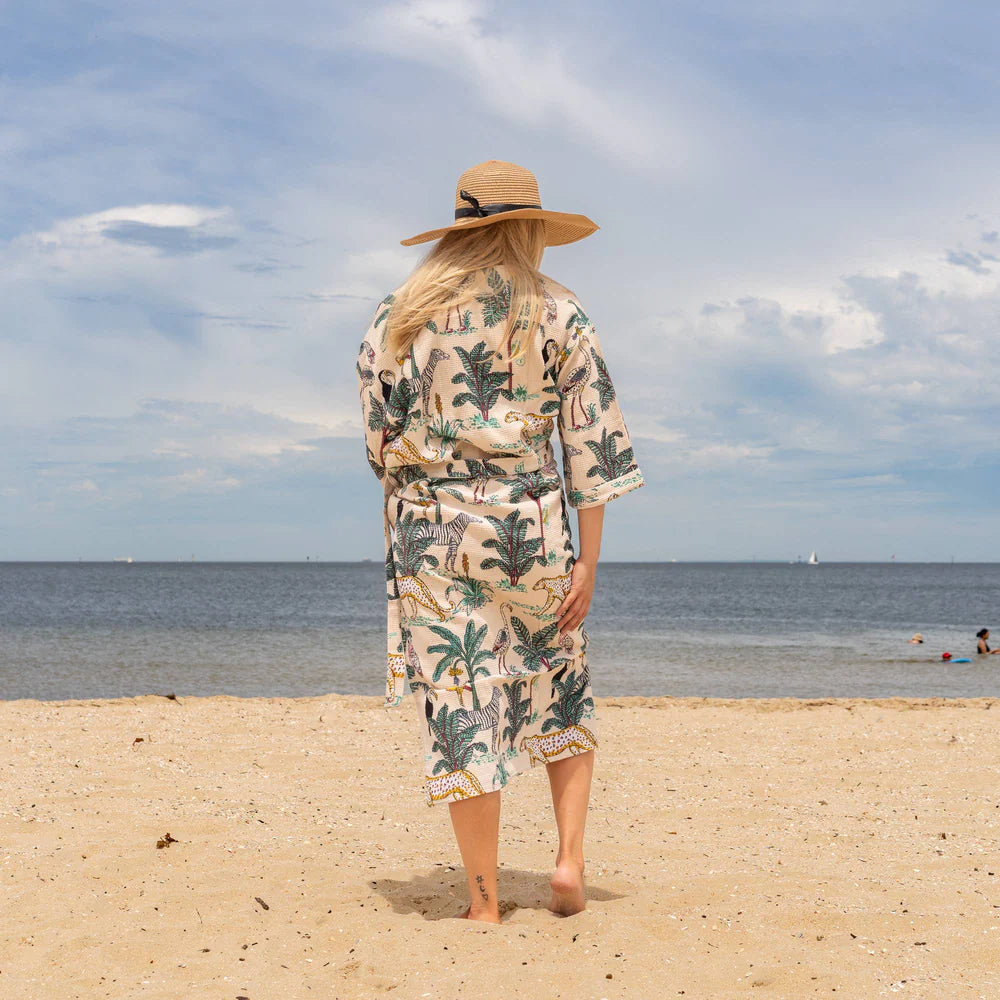 COTTON WAFFLE BATH ROBE KIMONO - JUNGLE JIVE WHITE