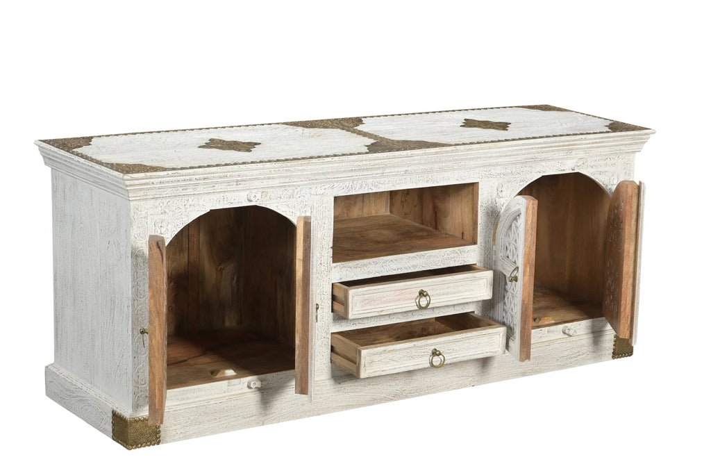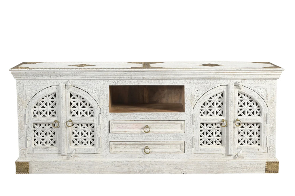 HANDCRAFTED MAHIKA CARVED WOOD DISTRESSED WHITE CONSOLE SIDEBOARD TV UNIT