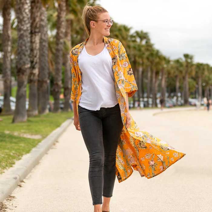 Cotton Kimono Bathrobe Cardigan Dressing Gown - mustard yellow paisley