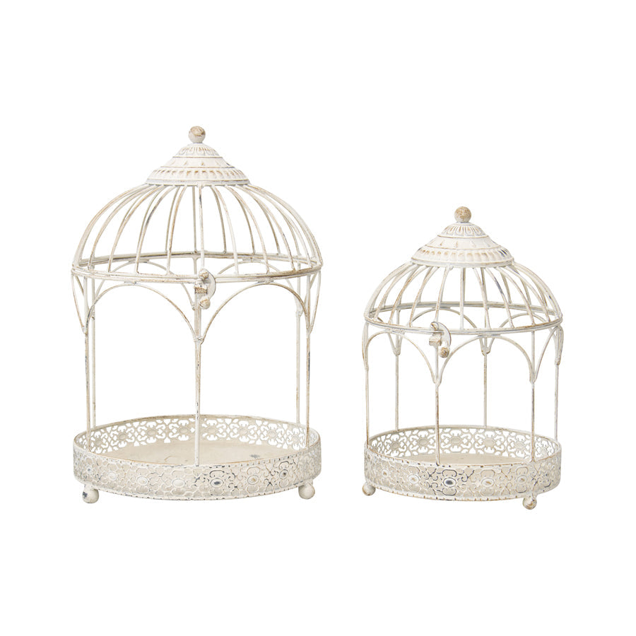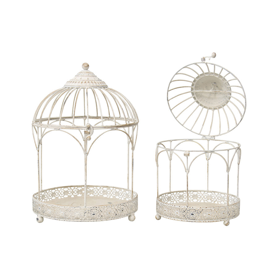 Implement French style to your space with the Set of 2 French Plant Birdcages. Crafted from durable iron in an antique white finish, these planters will give your indoor or outdoor space an elegant feel that will bring charm, elegance and style to your home. Features a gorgeous birdcage design with lovely intricate detailing in 2 different sizes, ready to style together on your console, side or dining table. Simply add a pot plant for a touch of greenery or why not add pillar candles to create soft ambience in your home.