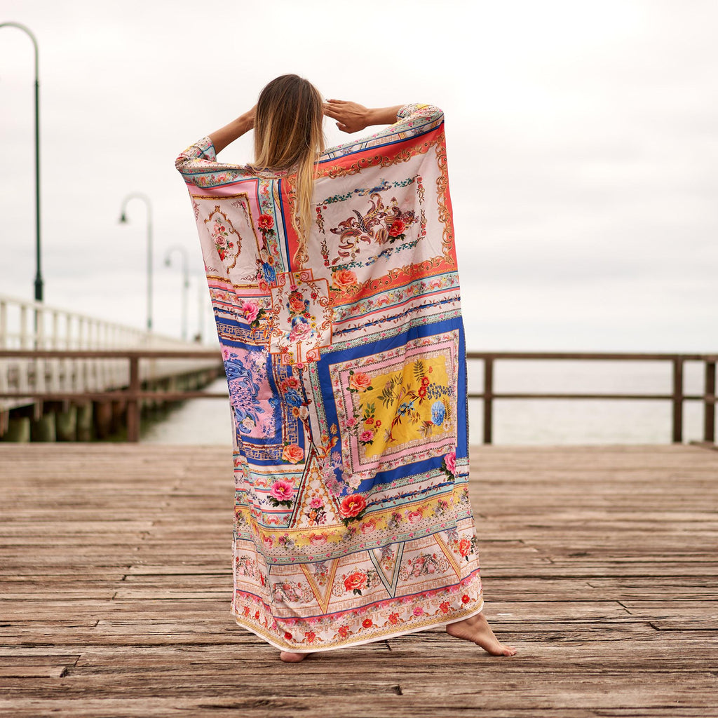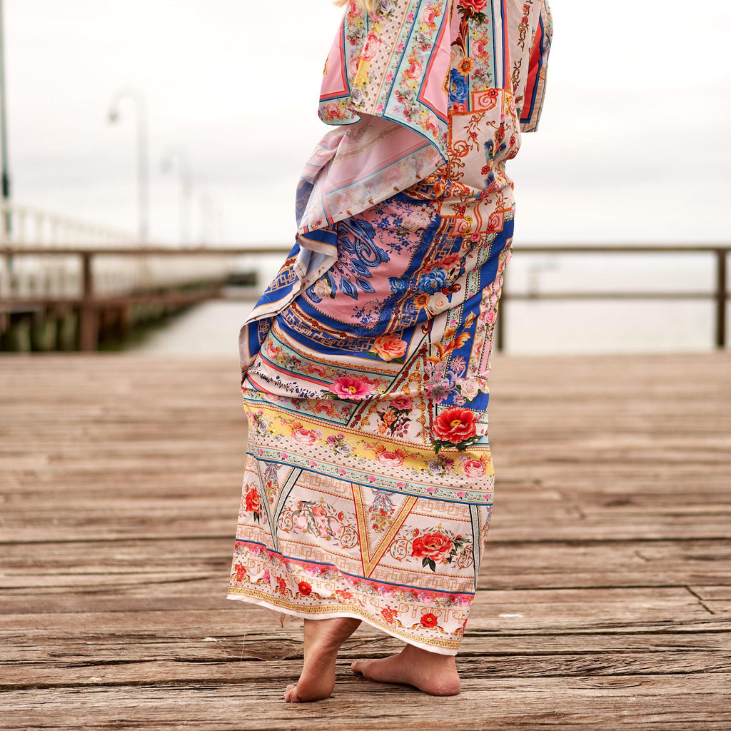These gorgeous silk kaftans have comfy kimono sleeves to move and groove carefree. This kaftan has stunning, bold colours and patterns.