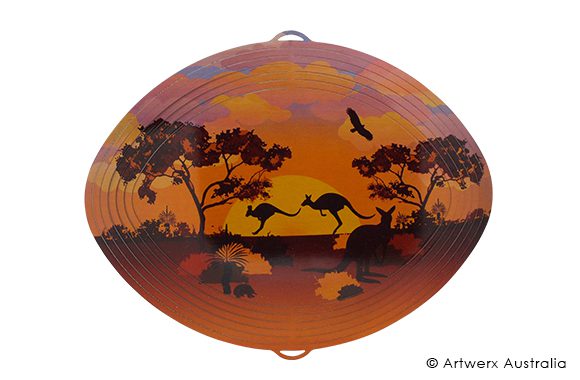Introducing our Outback Sunset Wind Spinner, capturing the serene beauty of the Australian outback. Featuring the striking, warm colours of a tranquil Australian sunset with native fauna and flora silhouettes. Measuring at 30cm, it brings the essence of the outback to any outdoor space.
