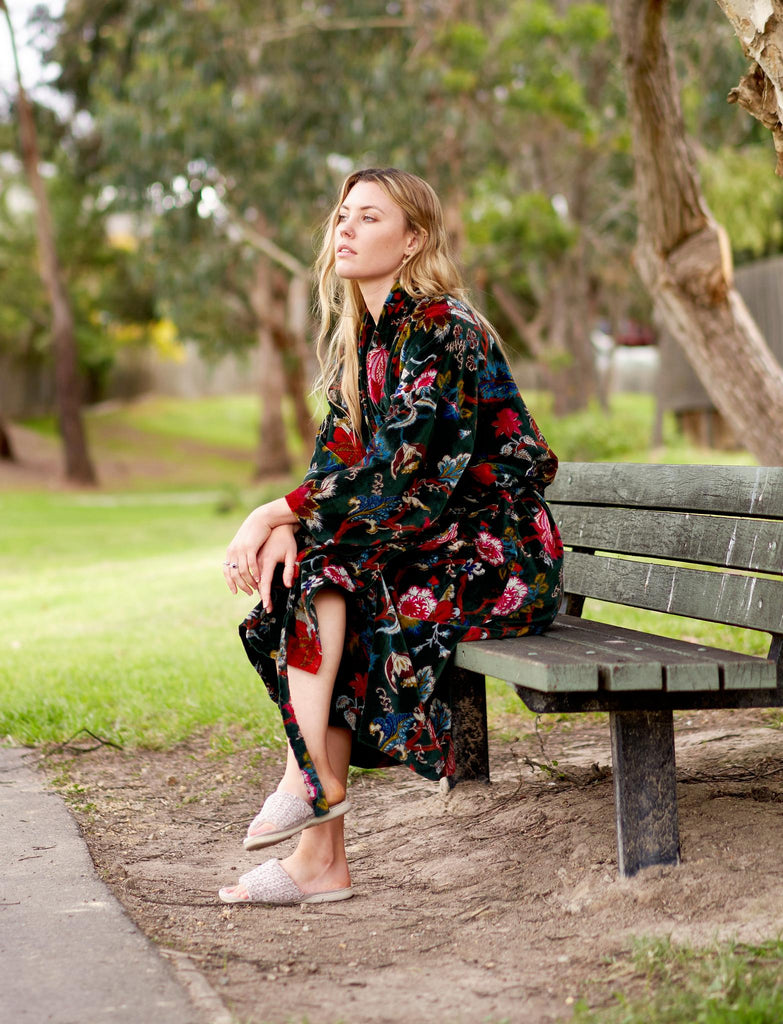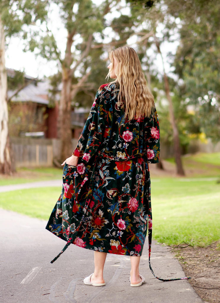 VELVET KIMONO ROBE -EMERALD FLORALS
