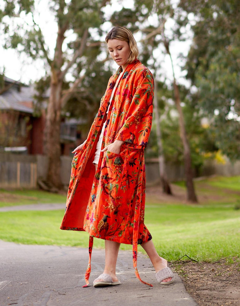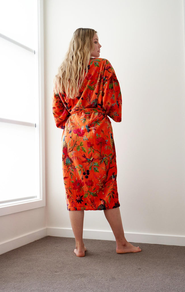VELVET KIMONO ROBE - TANGERINE BIRDS OF PARADISE